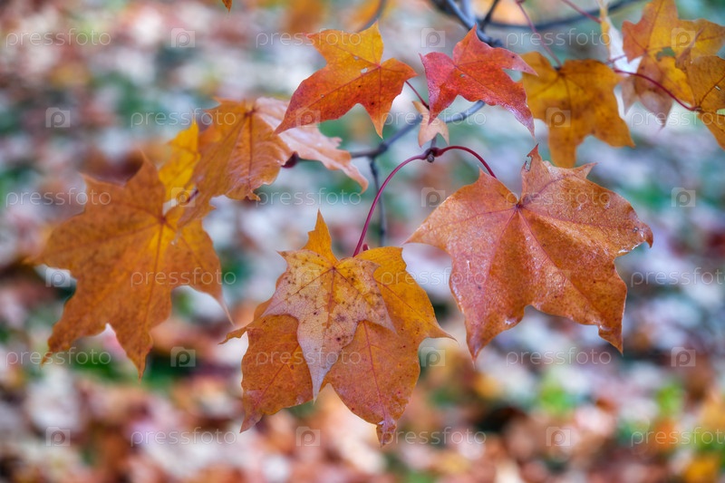 Мокрые ветви и кленовые листья оставляют осенние оранжевые и желтые листья после утренних морозов