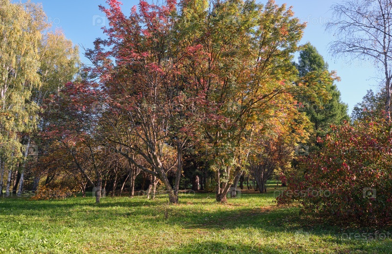 Осенний сад под голубым небом.Деревья с желтыми листьями