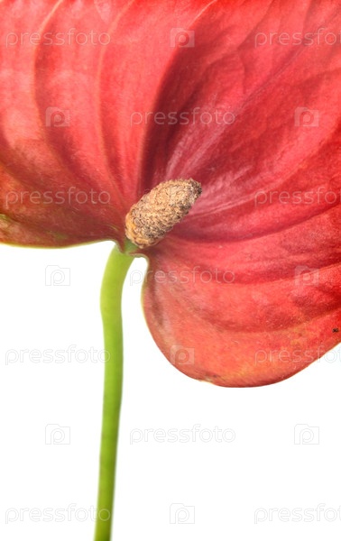 Экстремальный макро-близкий план красного фрагмента цветка антурии, изолированного на белом фоне, чрезвычайно высокое разрешение