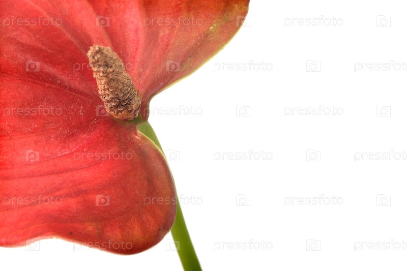 Экстремальный макро-близкий план красного фрагмента цветка антурии, изолированного на белом фоне, чрезвычайно высокое разрешение