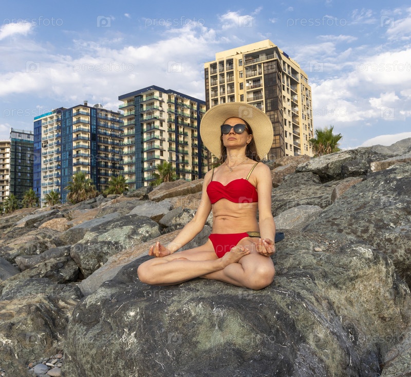 Привлекательная женщина с длинными волосами, в красном бикини и соломенной шляпе, на пляже, сидящая на большой скале, медитирует