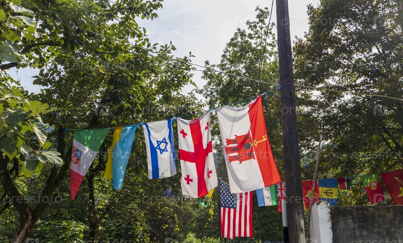 Стреляем различными флагами в веревку. Флаги Грузии, Израиля и Украины посередине. Американский флаг позади нас. Устройства