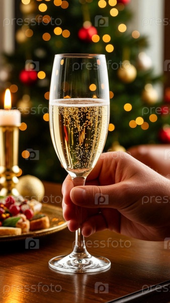 Стакан шампанского в руке мужчины на фоне рождественской елки и праздника