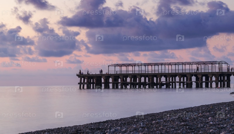 Концептный снимок мужчин, ловящих рыбу на заброшенном пирсе, мосту из металлических стержней во время драматического заката