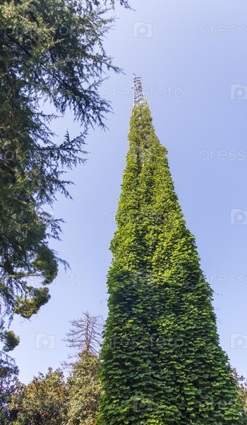 Изображение высокой радиомачты, покрытой растениями скалолазания