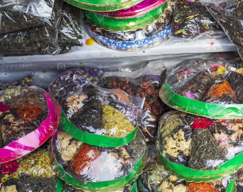 Картина различных видов чая, специй в магазине фермера