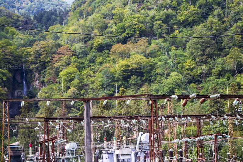 Высоковольтные линии электропередач с лесом на заднем плане. промышленный