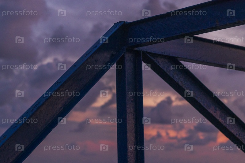 Абстрактный снимок металлических строительных блоков с облачным закатом солнца на фоне