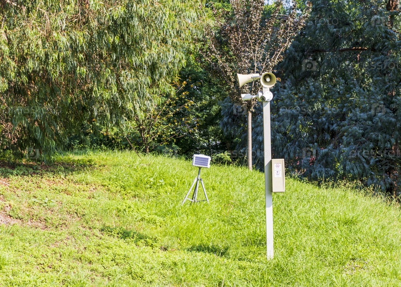 Солнечная панель освещения в парке является экологически чистой концепцией возобновляемых источников энергии. спикер и камера наблюдения рядом с ним. снаружи