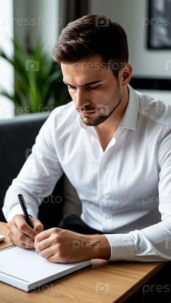 Концентрированный человек пишет в блокноте, сидя в офисе