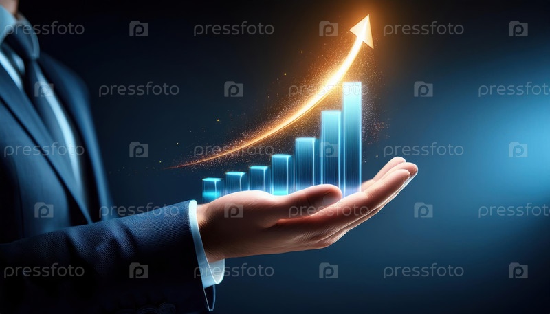 Бизнесмен поддерживает яркий график с восходящей тенденцией, показывающей рост и успех в концепции современных технологий