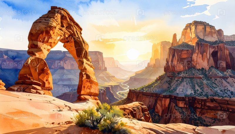 Иллюстрированный ландшафт каньона на рассвете с естественной каменной аркой, вызывающей туристическое вдохновение, национальные парки и темы сохранения