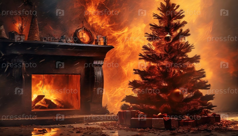 Горящий камин с украшенной рождественской елкой в огне, показывающий интенсивную и драматическую сцену, наполненную пылающими пламенами и дымом