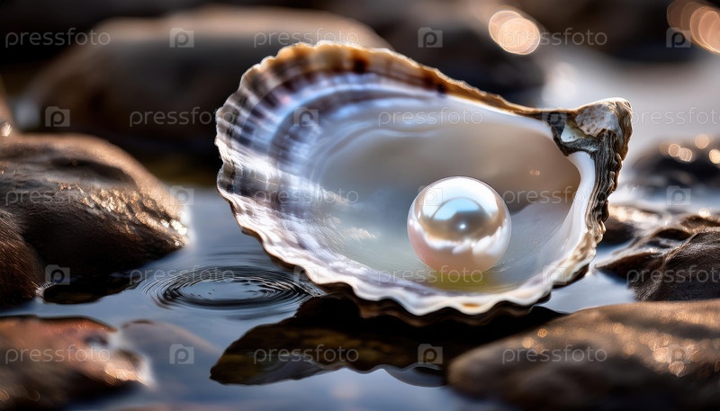 Открытая раковина устрицы с идеальным круглым жемчугом, отдыхающим внутри, в окружении воды и гладких камней
