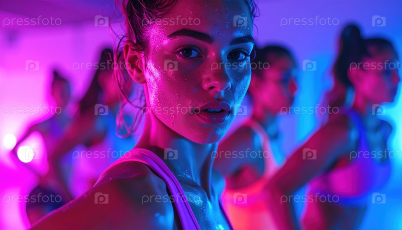 Группа женщин потеет во время высокоэнергетических фитнес-тренингов в неоновой студии
