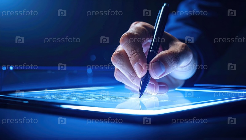 Человек, подписывающий документ на цифровом экране при плохом освещении, фиксирует переход к бесбумажным рабочим процессам, технологии электронной подписи и текущие тенденции в аутентификации контрактов