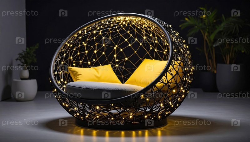 Уютное освещенное яйцо кресло с волшебными огнями в современной комнате, символизируя расслабление, комфорт и творческую эстетику интерьера