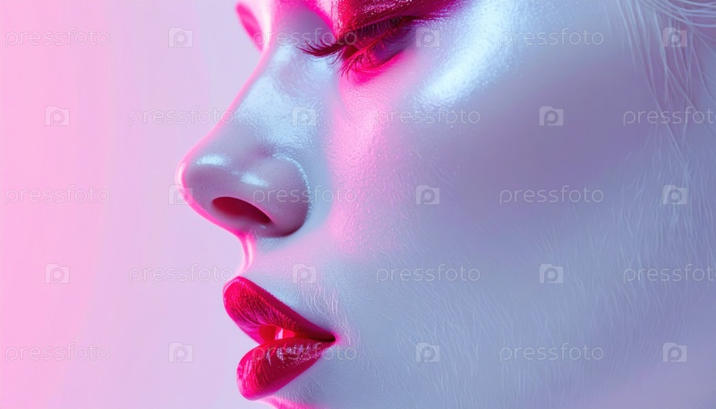 Боковый профиль цифровой женщины в неоновом розовом свете, показывающий футуристическую моду, тренды красоты искусственного интеллекта и концепции виртуального влияния