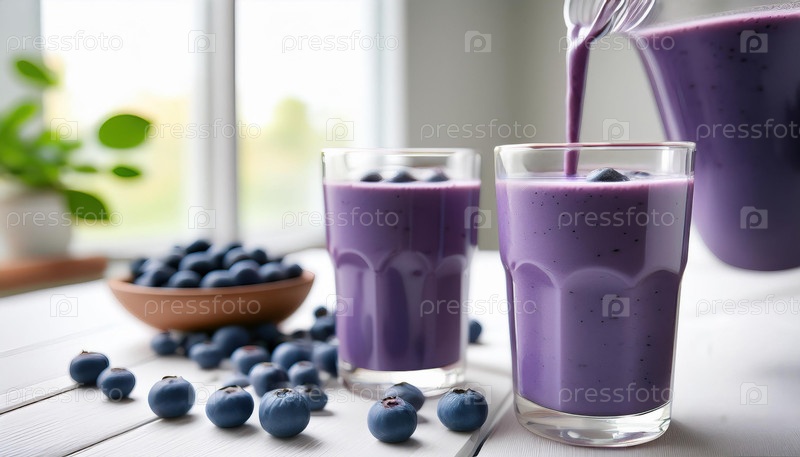 Голубиный смузи в стакане на белом деревянном столе с свежими ягодами и ярким фоном окна