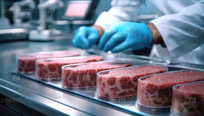 Лабораторный ассистент для обработки упакованных мраморных стейков в стерильной среде производства продуктов питания