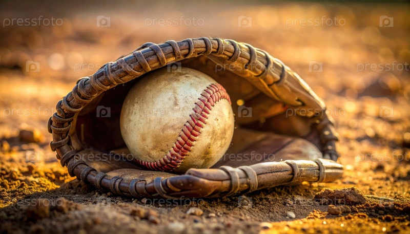 Близкий план бейсбола в изношенной перчатке на грязи, символизирующий американскую спортивную культуру, ностальгию и вечный шарм классических игр на свежем воздухе