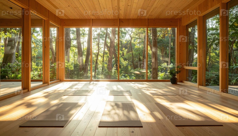 Спокойная студия йоги с солнечным светом, протекающим через стеклянные стены в деревянную комнату, окруженную древесиной