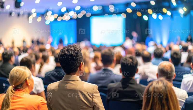Аудитория бизнес-конференций или семинаров, слушающая ключевых докладчиков, представляющих современные коммуникационные, образовательные и сетевые мероприятия