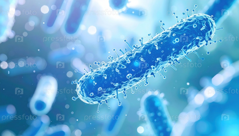 3D-иллюстрация бактерий в синем цвете под микроскопом с цифровыми световыми эффектами