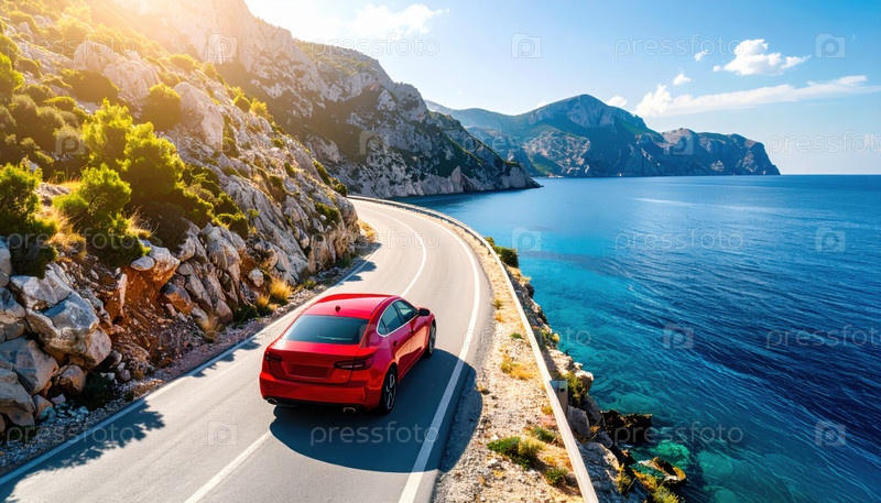 Красная машина едет по прибрежной автомагистрали с горами и морем, вызывая свободу, летние путешествия и живописные приключения