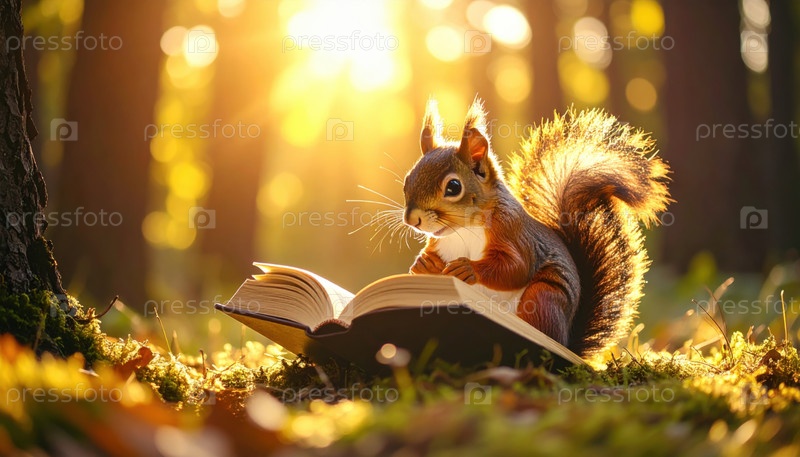 Странная концепция белки, читающей книгу в лесу, идеально подходит для образовательных кампаний, детской литературы или осенних рассказов