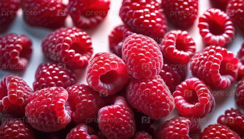 Свежие яркие малины, расположенные близко друг к другу в естественном свете, подчеркивают текстуру и сочность спелых фруктов