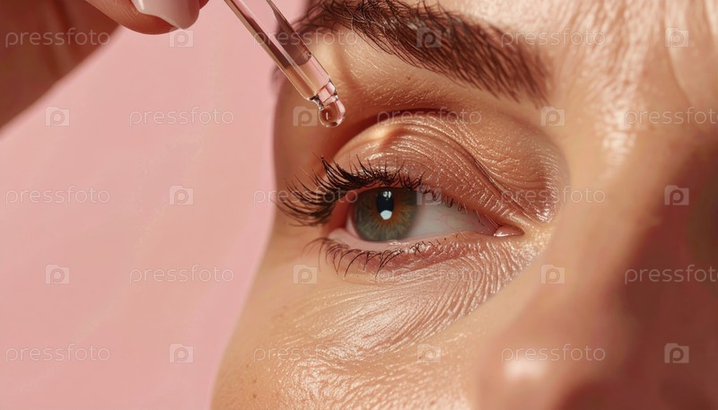 Удар глаз капельницей с использованием сыворотки для ухода за кожей на век на мягком розовом фоне