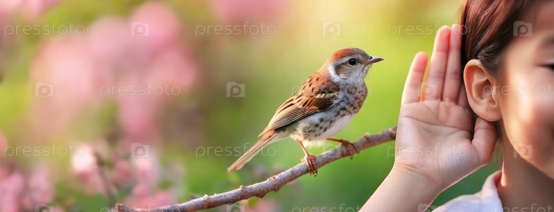 Близкий план человека, забивающего ухо рядом со воробьем, представляющий борьбу с потерей слуха и тиннитусом