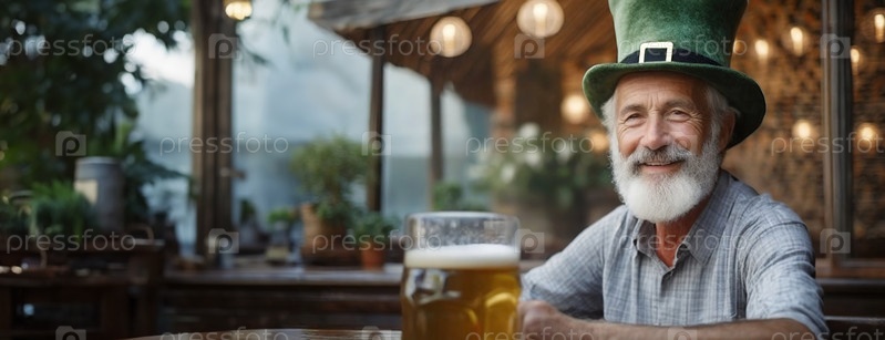 Веселый пожилой человек сидит с пинтой пива в уютной и хорошо освещенной таверне.Старейший мужчина с теплой улыбкой празднует День Святого Патрика, держа пенообразное пиво в руках.В хорошем настроении джентльмен носит традиционную зеленую шляпу