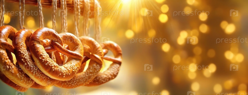 Близкий план нескольких свежевыпеченных прецеллов, висящих на струнах с золотым фоном боке, предлагая теплую праздничную обстановку