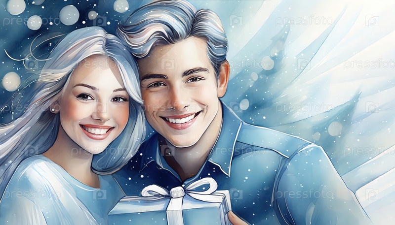 Иллюстрированная пара держит в руках подарок, улыбаясь перед камерой со снежной рождественской елкой на заднем плане в праздничной праздничной сцене