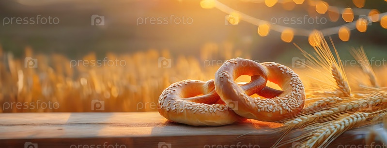 Два свежевыпеченных брецеля с кунжутными семенами на деревянном столе, среди золотистого поля пшеницы при закате солнца, вызывают теплую и рустичную атмосферу