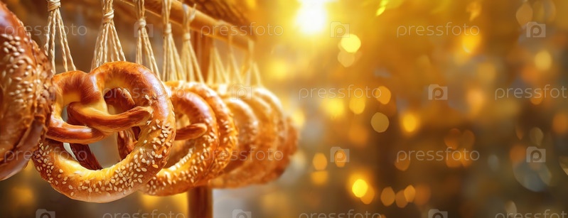 Ряд свежевыпеченных прецеллов, висящих на веревках, освещенных теплым золотым светом, указывают на пекарню или продовольственный рынок