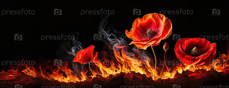 Ярко-красные маки на тёмном фоне с пламенем огня, создавая драматический и интенсивный фон для Дня перемирия
