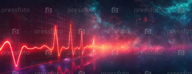 Линия ЭКГ светит ярко-красным цветом на космическом фоне, представляя медицинские технологии и мониторинг в футуристической обстановке