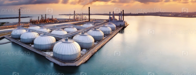Объект хранения СПГ с несколькими большими сферическими резервуарами, расположенными на водоеме во время захода солнца. Большое промышленное сооружение с городом на заднем плане. Панорама с копировальным пространством