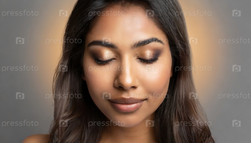 Женщина с золотым макияжем на глазах позирует со закрытыми глазами под мягким теплым освещением