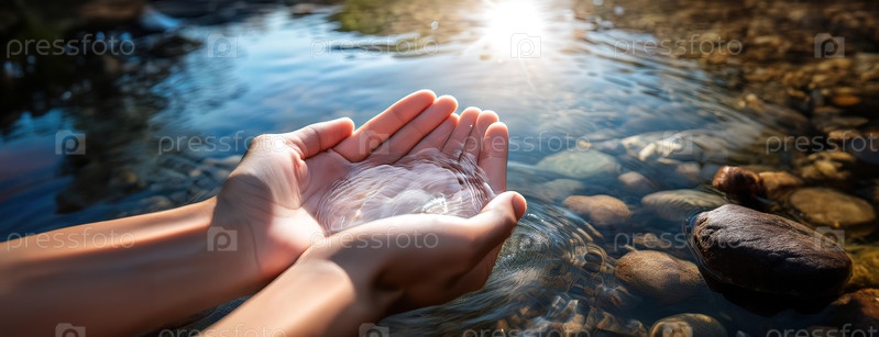 Руки, держащие воду из чистого естественного потока в солнечном лесу