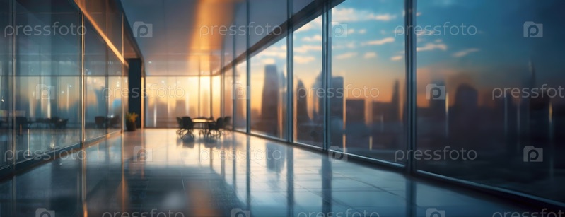 Современное офисное пространство со стеклянными стенами с видом на городской пейзаж при закате солнца, с отражением городских огней на полу