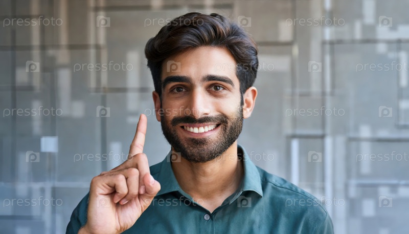 Улыбающийся уверенно указывает вверх, предлагая идею или концепцию в современном интерьере