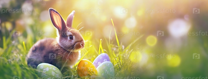 Пасхальный кролик на весенней зеленой лужайке с украшенными красочными яйцами на заднем плане Панорама с копией пространства