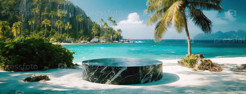 Пустой продукт из черного мрамора стоит на белом тропическом пляже с пальмами в фоне
