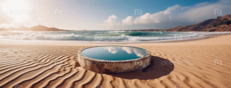 Круглая бетонная платформа на песчаном пляже с океанскими волнами на фоне яркого неба