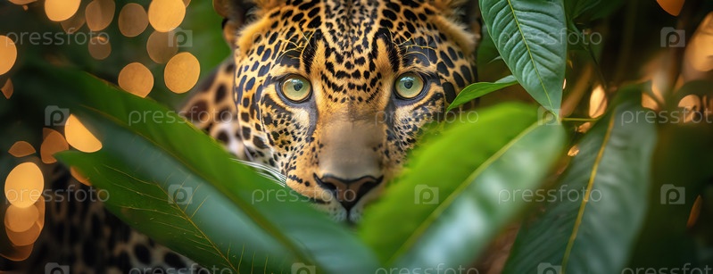 Близкий план глаз леопарда, заглядывающего в густую листву джунглей, подчеркивая его интенсивный вид и пятнистые шерсти