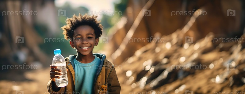 Веселый ребенок держит бутылку воды в солнечном бедном районе.Надежда светит сквозь невзгоды, напоминание о стойкости и выживании.Панорама с копировальным пространством